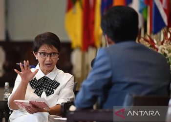 Menteri Luar Negeri (Menlu) Republik Indonesia Retno Marsudi (kiri) menjawab pertanyaan pembawa acara Podcast Antara Rully ...
