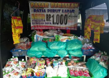 Bripka Zulham saat melayani seorang wanita paruh baya, yang membeli bahan masakan di Pasar Berjalan RPL ...
