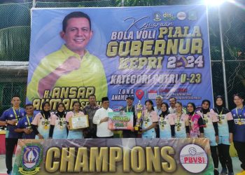 Gubernur Kepri Ansar Ahmad, saat foto bersama seusai menyerahkan hadiah kepada tim yang menang Turnamen Bola ...