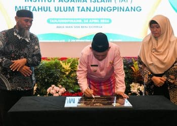 Gubernur Kepulauan Riau H. Ansar Ahmad saat menandatangani prasasti di Aula Wan Seri Beni, Dompak, Tanjungpinang, ...