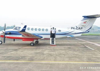 Menhub usai Prosesi lepas landas dan pendaratan di runway Bandara Halim menggunakan pesawat kalibrasi jenis King ...