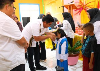 DM - Bupati Bintan, Roby Kurniawan didampingi Wakil Bupati, Ahdi Muqsith menyerahkan bantuan seragam sekolah gratis bagi siswa baru TK, ...