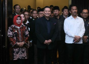 Sekjen DPN Peradi, Hermansyah Dulaimi, (baju putih) didampingi Ketua Peradi Tanjungpinang, Agung Wira Dharma (paling kiri) ...