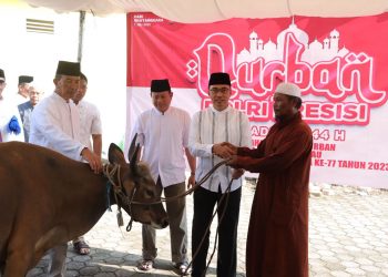 Polres Bintan saat menyerahkan sapi kepada pihak panitia untuk dilakukan penyembelihan, foto: ist DM – Dalam ...