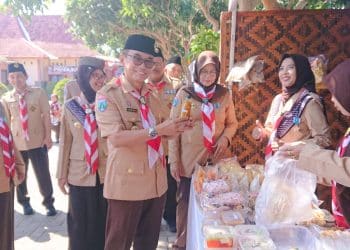 Wawali Blitar Tjutjuk saat menunjukkan minuman jamu tradisional buatan siswa pramuka. DM, BLITAR – Wakil Walikota ...